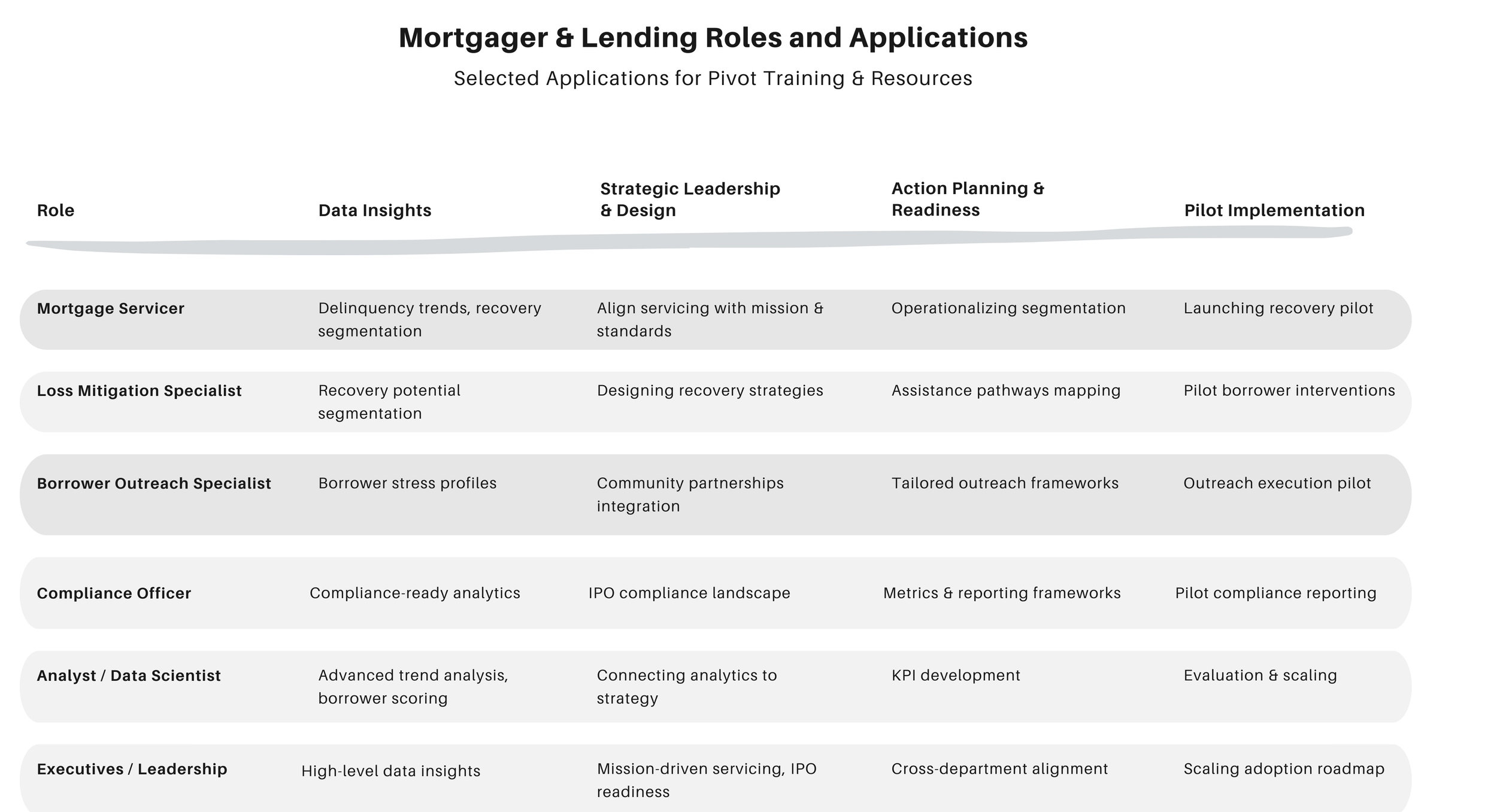 The Pivot Certification Track equips mortgage servicers, lenders, and creditors with the tools, strategies, and recognition to achieve measurable results for borrowers, investors, and communities. Through a three-stage pathway, organizations progress from training to operational excellence to industry leadership.